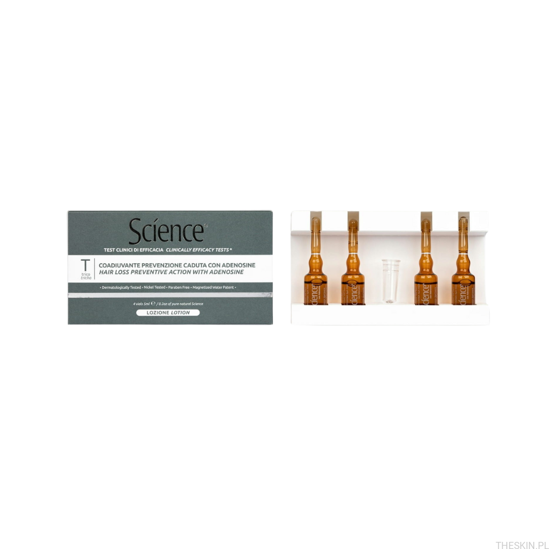 Science Lotion to specjalistyczny produkt trychologiczny w formie ampułek, stworzony z myślą o pielęgnacji skóry głowy z problemem osłabienia włosów, nadmiernego ich wypadania lub spowolnionego wzrostu. Zawiera adenozynę – aktywny nukleozyd, który stymuluje czynniki wzrostu FGF7 i VEGF, odpowiedzialne za prawidłowy cykl życia włosa.